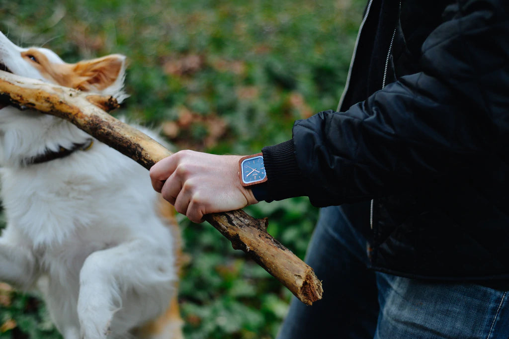 This unisex watch shows hour, minute, and second markers on a square dial. The Labrador is made from 100% recycled or reclaimed wood, with Swiss Watch Movement and is adjustable in size.
